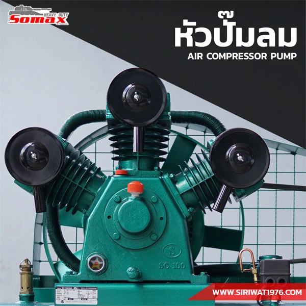หัวปั๊มลม 10 แรงม้า มีลูกสูบเส้นผ่าศูนย์กลางขนาด 100 มม. จำนวน 3 หัว