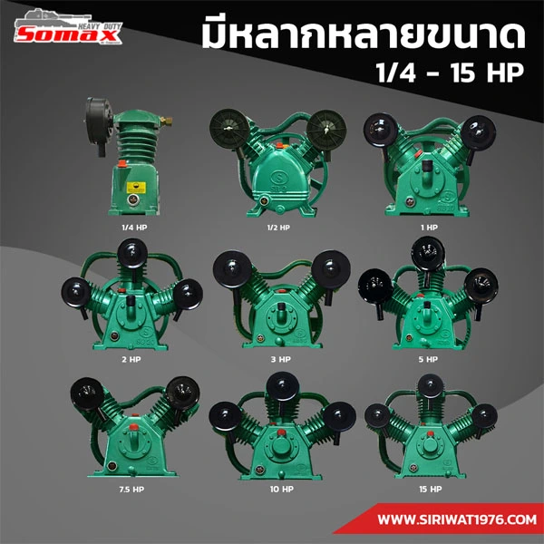 มีหลากหลายขนาด ตั้งแต่ ½ แรงม้า จนถึง 15 แรงม้า ซึ่งค่อนข้างครอบคลุมหลากหลายธุรกิจ ตั้งแต่งานช่างเล็กๆ น้อยๆ จนถึงโรงงานอุตสาหกรรมขนาดเล็กหรือศูนย์บริการรถยนต์เป็นต้น
