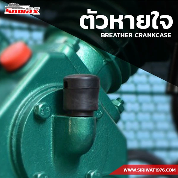 ตัวหายใจ (BREATHER CRANKCASE) ชิ้นส่วนเล็กๆทำด้วยพลาสติก แต่สำคัญมาก เพราะตัวหายใจจะช่วยให้มีการไหลเวียนเข้าออกของอากาศภายในหัวปั๊มลม ช่วยลดความร้อนและแรงดัน ถ้าหากเราเอาวัสดุอื่น หรืออุปกรณ์อื่นมาอุดแทน อาจจะทำให้เกิดอุบัติเหตุร้ายแรง เช่นหัวปั๊มลมระเบิดได้ หรือถ้าตัวหายใจหลุดหาย ก็อาจจะทำให้น้ำมันเครื่องกระเด็นออกมาทางรูหายใจได้