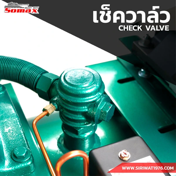 เช็ควาล์ว (CHECK VALVE) เช็ควาล์กันกลับ ทำหน้าที่ให้ลมที่ผลิตได้จากหัวปั๊มลมลงสู่ถังพักลม และป้องกันลมจากถังพักลมให้ย้อนกลับเข้าไปในหัวปั๊มลม