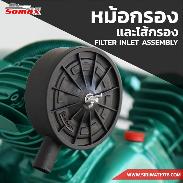 หม้อกรองและไส้กรอง (FILTER INLET ASSEMBLY) ทำหน้าที่คอยดักฝุ่นและสิ่งแปลกปลอมไม่ให้เข้าไปในบริเวณกระบอกสูบ เพราะเศษฝุ่นและสิ่งแปลกปลอมเหล่านี้จะเข้าไปทำลายลูกสูบ กระบอกสูบ รวมถึงอาจจะไปอุดตันบริเวณวาล์ว ทำให้ปั๊มลมทำงานเสื่อมเร็วขึ้น วิธีดูแลรักษาให้หมั่นแกะหม้อกรองและเอาไส้กรองออกมาเป่าเศษฝุ่นที่เกาะไปออกอยู่เสมอ ควรทำประจำอย่างน้อยสัปดาห์ละ 1 ครั้ง