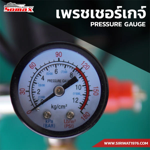 เพรชเชอร์เกจ์ (PRESSURE GAUGE) ทำหน้าที่คอยบอกแรงดันที่อยู่ในถังลม โดยจะบอกแรงดันของในในรูปแบบ kg/cm2 (บาร์) และ C.F.M. ปอนด์ โดย มีวิธีแปลงค่าจาก บาร์เป็นปอนด์ หรือ ปอนด์เป็นบาร์ ดังนี้ 1 kg/cm2 = 14.5 psi