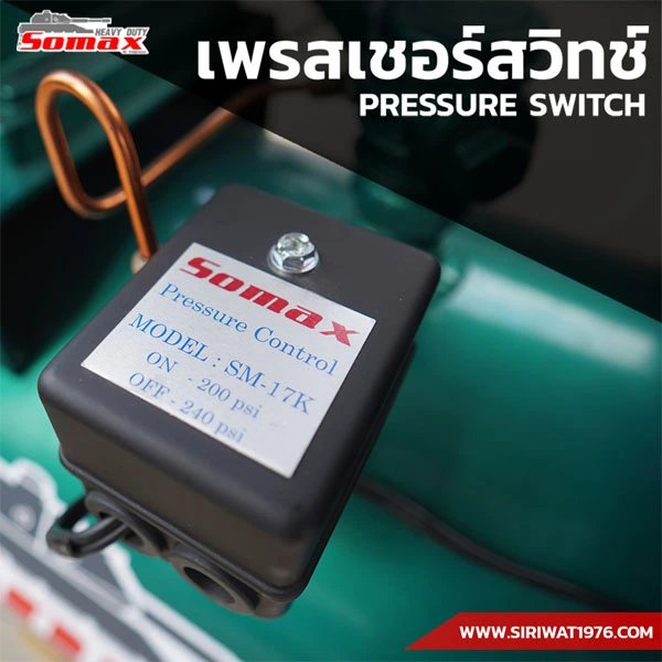 เพรสเชอร์สวิทช์ (PRESSURE SWITCH) ทำหน้าที่สั่งให้ปั๊มลมทำงาน เมื่อแรงดันในถังลมลดมาถึงจุดต่ำสุดที่ตั้งไว้ และจะตัดลม หรือสั่งหยุดการทำงานเมื่อแรงดันสูงถึงจุดที่ตั้งไว้เช่นกัน ซึ่งเราสามารถเพิ่มหรือลดแรงดันในการทำงานได้ที่เพรสเชอร์สวิทช์ วิธีตั้งหรือปรับแรงดันปั๊มลม ให้เพิ่มขึ้นหรือลดลงสามารถดูได้ที่นี้ https://www.siriwat1976.com/knowledge-how-to-adjust-pressure-switch-on-air-compressor
