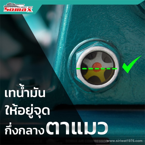 2.) เทน้ำมันเครื่องปั๊มลมให้อยู่ในระดับจุดกึ่งกลางของตาแมว