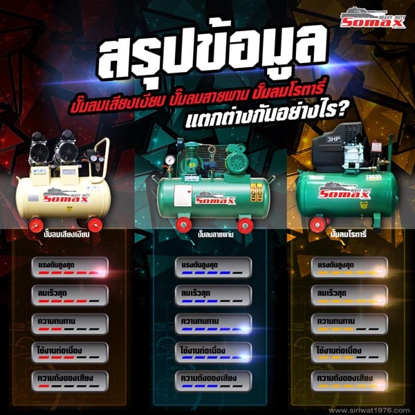 หากถามว่าปั๊มลมแบบไหนดีที่สุด คำตอบก็คือ ไม่มีปั๊มลมที่ดีที่สุด เพราะปั๊มลมแต่ละแบบ มีคุณสมบัติและข้อดี-ข้อเสีย ที่แตกต่างกันไป ปั๊มลมแต่ละแบบแตกต่างกันอย่างไร แบบไหนที่เหมาะกับการใช้งานของคุณมากที่สุด วันนี้ SOMAX จะมาเปรียบเทียบคุณสมบัติของปั๊มลมแต่ละแบบ ตามหัวข้อต่างๆ ดังนี้