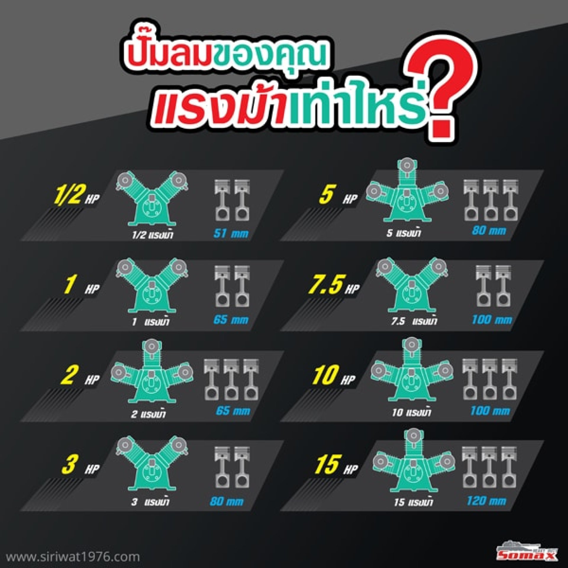 ปั๊มลมที่คุณสนใจหรือมีใช้อยู่ ตามมาตรฐานแล้วมีขนาดกี่แรงม้า? ทำไมซื้อตามที่คนอื่นแนะนำแล้วทำลมได้ไม่พอ ซึ่งอาจจะเป็นเพราะหัวปั๊มลมของคุณไม่ได้มีแรงม้า อย่างที่คุณเข้าใจ แรงม้าจากหัวปั๊มลม คือ กำลังในการผลิตลม ปริมาณลมที่ผลิตได้ ส่วนหนึ่งจะขึ้นอยู่กับแรงม้าของหัวปั๊มลม หัวปั๊มลมแรงม้าน้อยก็ผลิตลมได้น้อย แรงม้าเยอะก็ผลิตลมได้เยอะตามขนาดของแรงม้า ซึ่งหัวปั๊มลมแต่ละขนาด ก็จะมีลูกสูบขนาดต่างๆ และจำนวนของลูกสูบ ดังนี้