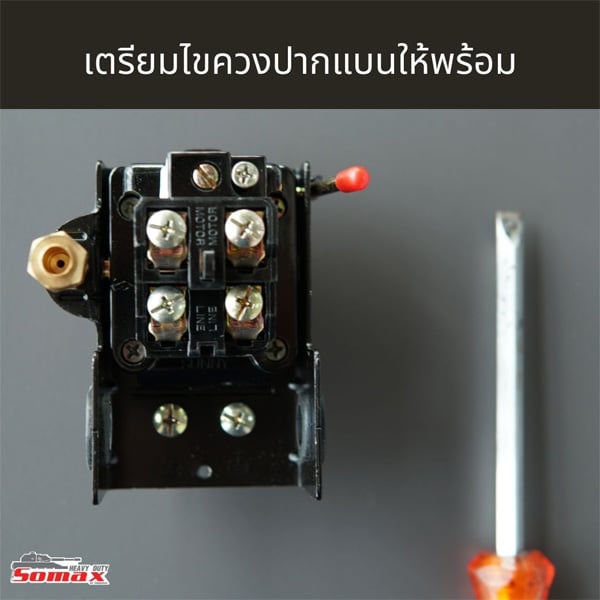 เมื่อลมเต็มถังแล้ว ให้ใช้ไขควงเปิดฝาเพรสเชอร์สวิทช์ออกก่อน ควรระมัดระวังไม่ให้ส่วนใดของร่างกายสัมผัสโดยตรงบริเวณเพรสเชอร์สวิทช์เพราะมีกระแสไฟวิ่งอยู่จะเกิดอันตรายจากไฟฟ้าได้