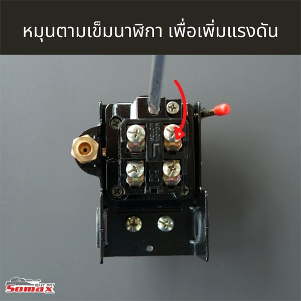 หากต้องการเพิ่มแรงดันให้ใช้ไขควงปากแบนเสียบแล้วหมุนไปทางขวาหรือตามเข็มนาฬิกา ให้หมุนจนกว่าปั๊มลมจะเริ่มทำงานอีกครั้ง นั่นหมายความว่าแรงดันได้ถูกปรับแล้ว ให้หยุดหมุนไขควง