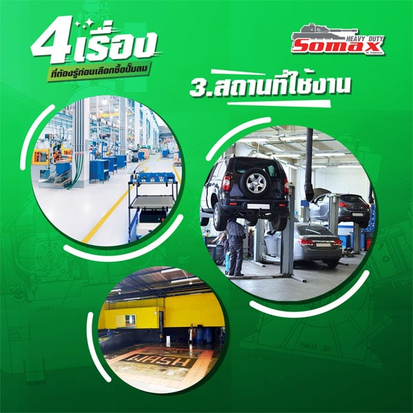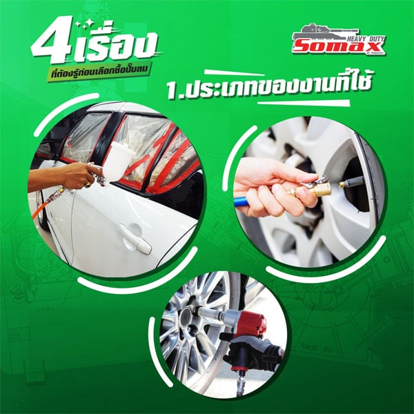 1.) ประเภทของงานที่ใช้ งานแต่ละประเภท ก็ต้องเลือกใช้ปั๊มลมต่างกันไปตามประเภทของงาน เช่นใช้งานในบ้านทั่วไป งาน DIY เล็กน้อย งานแบบมืออาชีพเช่นคาร์แคร์ อู่ซ่อมรถยนต์หรืองานในระบบอุตสาหกรรมเป็นต้น