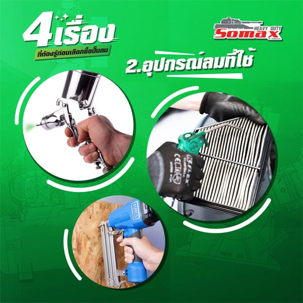 2.) อุปกรณ์ลมที่ใช้ แต่ละอุปกรณ์ก็ต้องการปริมาณลมที่แตกต่างกันไป รวมถึงความต่อเนื่องของลม เช่นยิงตะปูลม ใช้ลมน้อยและสั้น กาพ่นสีก็จะใช้ลมเยอะและต่อเนื่องกว่างานทั่วไป ยิ่งถ้าใช้งานพ่นสีของชิ้นใหญ่ ลมต้องแรงและต้องเร็ว หรือ งานประเภทเติมลมหรือใช้บล็อกลม ก็ต้องเลือกขนาดของปั๊มลมให้เหมาะกับขนาดรถเช่นกัน