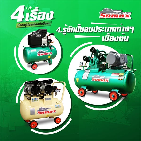 4.) รู้จักปั๊มลมประเภทต่างๆ เบื้องต้น ปั๊มลมประเภทต่างๆ ย่อมมีทั้งข้อดีและข้อเสีย ส่วนใหญ่ที่จะเห็นผ่านตากันก็จะมีอยู่ 3 ประเภท ได้แก่ปั๊มลมแบบลูกสูบ(สายพาน) ปั๊มลมโรตารี่ และปั๊มลมออยฟรี ซึ่งแต่ละแบบก็มีข้อดีข้อเสียแตกต่างกัน ( สามารถอ่านเพิ่มเติมได้ที่ httpsbit.ly3dxLslJ ) ซึ่งก็เป็นอีกหนึ่งปัจจัยในการตัดสินใจเลือกซื้อปั๊มลมอีกด้วย