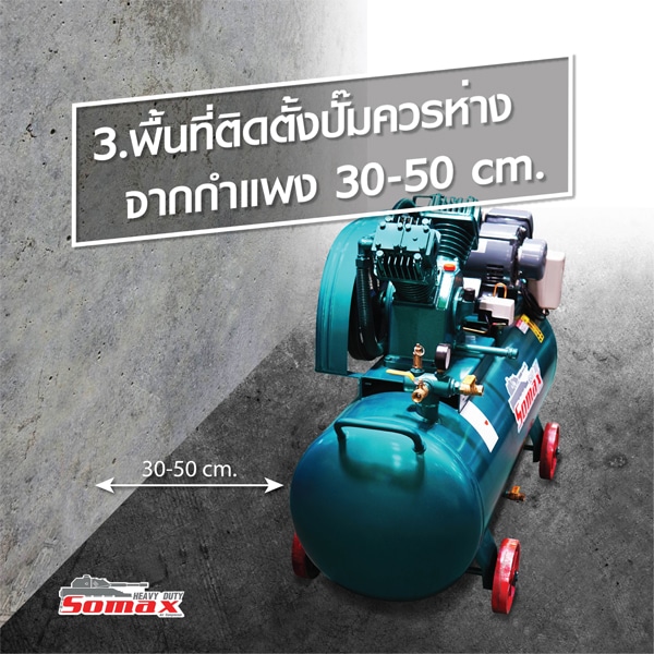 ควรจะอยู่ในที่ๆ อากาศถ่ายเทดี ไม่ร้อนและไม่ชื้น มีฝุ่นน้อย หลักการง่ายๆ ว่าถ้าหากคนอยู่ไม่ได้ ปั๊มลมก็อยู่ไม่ได้เช่นกัน ปั๊มลมควรตั้งห่างจากกำแพงอย่างน้อย 30 50 ซ.ม. เพื่อให้อากาศถ่ายเทได้ดี และเข้าไปดูแลรักษาปั๊มลมได้ง่าย