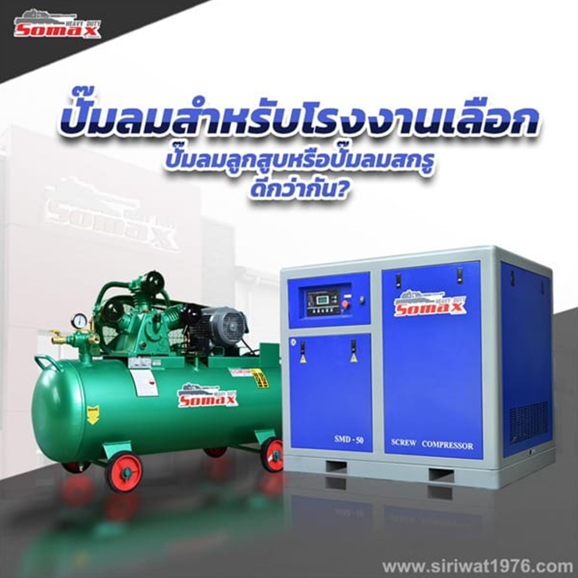 สำหรับผู้ที่เป็นเจ้าของธุรกิจ ที่มีแผนกผลิตและจำเป็นต้องใช้ปั๊มลมเพื่อขับเคลื่อนเครื่องจักรในสายการผลิต ปั๊มลมลูกสูบและปั๊มลมสกรู ต่างก็มีข้อเด่น ข้อด้อยต่างกันมากมาย ถ้าหากผู้ประกอบการรู้และเข้าใจก็จะสามารถเลือกปั๊มลมที่เหมาะสมกับธุรกิจได้ วันนี้ Somax จะมาอธิบายให้ฟัง