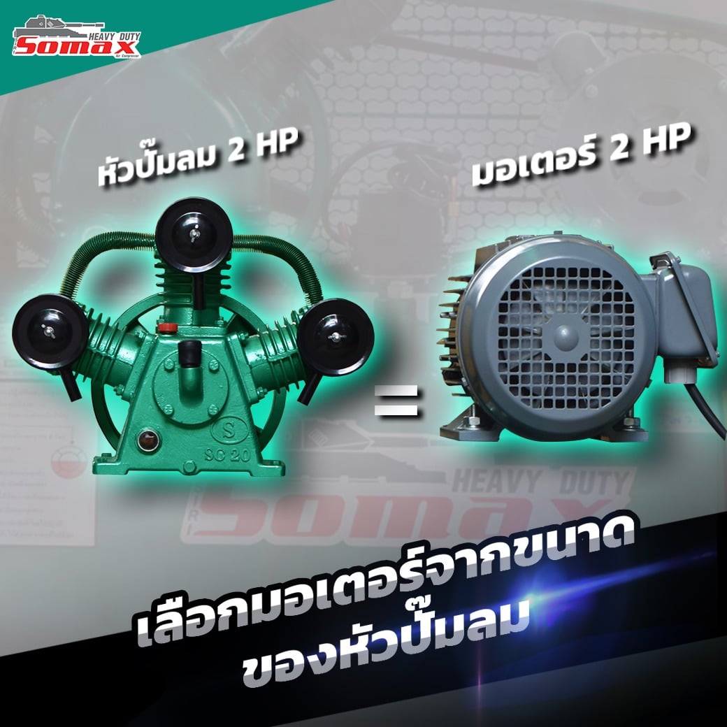 ปั๊มลมคุณภาพดีมักจะถูกจับคู่กับมอเตอร์คุณภาพดี โดยส่วนใหญ่แล้วจะเลือกจากแบรนด์ที่น่าเชื่อถือหรือเป็นที่รู้จักกันอย่างดี โดยการเลือกมอเตอร์ควรเลือกจาก ขนาดแรงม้าของมอเตอร์ให้เท่ากับขนาดแรงม้าของหัวปั๊มลม ยกตัวอย่างเช่น ปั๊มลม 3 แรงม้า ควรใช้มอเตอร์ที่ตรงสเปกคือ 3 แรงม้า เพื่อให้ปั๊มลมทำงานอย่างมีประสิทธิภาพ ทนทาน และช่วยในการประหยัดไฟ