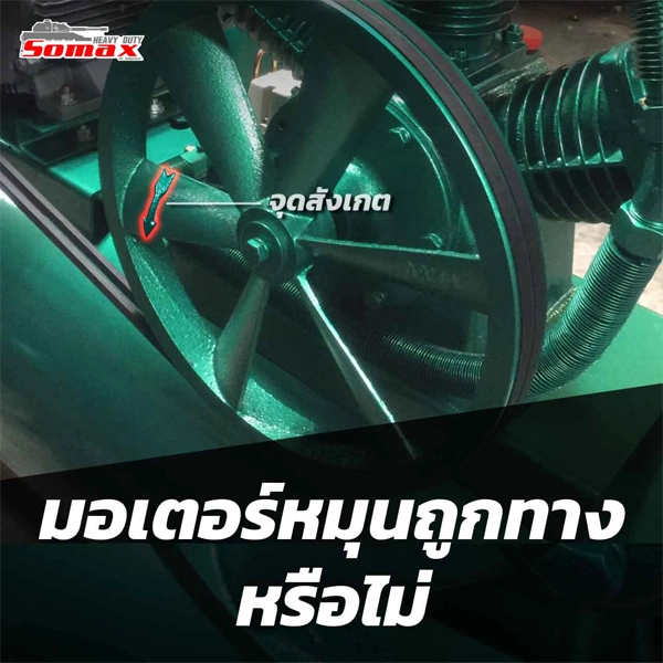 หมั่นสังเกตว่ามอเตอร์หมุนถูกทิศหรือไม่ ปกติที่หัวปั๊มลมลูกสูบที่ได้มาตรฐานจะมีลูกศรชี้เสมอว่าใบพัดและมอเตอร์ควรหมุนไปทางใด เหตุการณ์ที่มอเตอร์หมุนผิดทาง มักจะเกิดกับปั๊มลมที่ใช้ไฟ 3 เฟส เมื่อช่างติดตั้งใส่สายไฟสลับ ก็จะทำให้มอเตอร์หมุนผิดทางได้ ควรให้ผู้ที่มีความชำนาญเกี่ยวกับเรื่องระบบไฟฟ้าช่วยเหลือในการติดตั้งและเมื่อติดตั้งปั๊มมลมเสร็จแล้ว ก็ควรตรวจสอบว่ามอเตอร์หมุนถูกทางหรือไม่