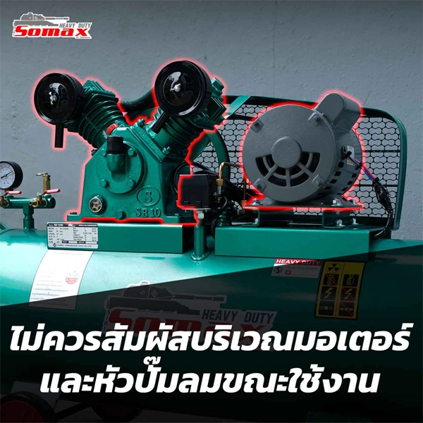 2.) ไม่ควรสัมผัสบริเวณมอเตอร์และหัวปั๊มลมขณะใช้งาน